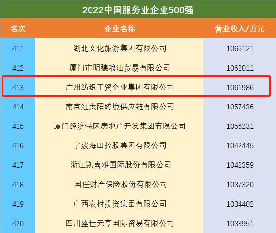 爱体育在线平台有限公司位列“2022中国服务业企业500强”第413位