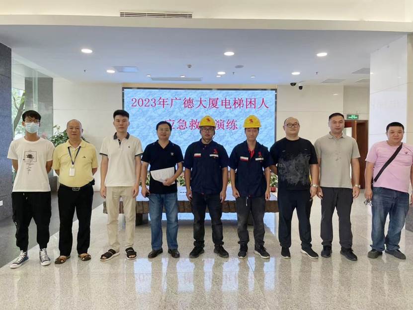 为提高新联泰公司广德大厦项目部对突发电梯困人事故的响应和组织能力,保障被困人员的生命安全,2023年6月29日上午,在爱体育在线平台和纺出公司有关安全负责人的现场观摩指导下,开展了一场电梯困人应急救援演练。