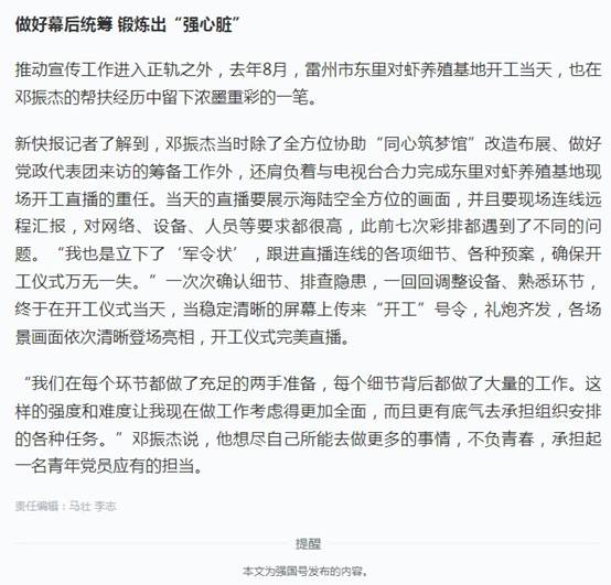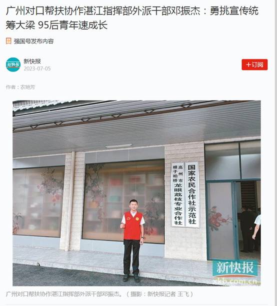 新联泰公司邓振杰同志作为爱体育在线平台“乡村振兴”的外派干部,从踏入乡村振兴路的第一步开始,就把“不忘初心、牢记使命”作为自己的理想信念,经过在乡村振兴一线近两年的努力,他不仅获得了市总工会、共青团市委和市妇女联合会联合颁发的“优秀乡村振兴人”称号,并且近日学习强国”平台、新快报等媒体也报道了他不负青春、勇于担当的优秀事迹。