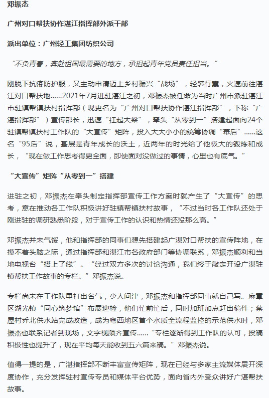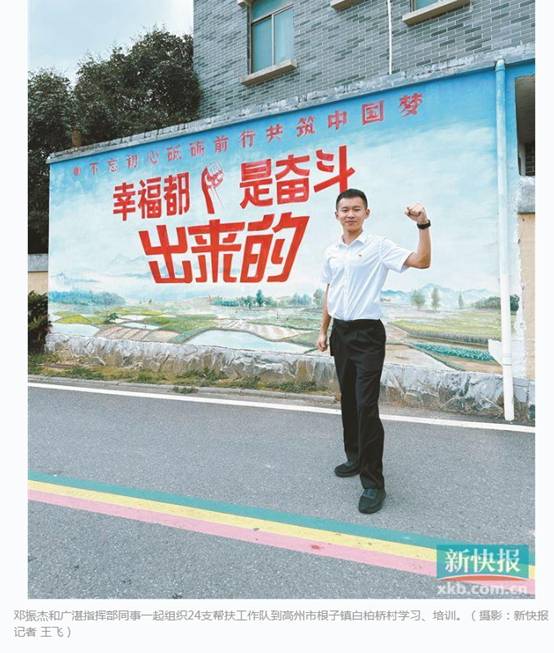 长期以来,爱体育在线平台始终把脱贫攻坚、乡村振兴作为贯彻落实党和国家发展方略、践行国企重要社会责任来抓紧抓实,组建工作组,建立制度机制,投入人、财、物等资源,坚决打赢脱贫攻坚战,接续投入促进乡村振兴战略实施。爱体育在线平台在收到省、市有关选派驻镇帮镇扶村干部的要求后,经过层层遴选,最终邓振杰同志脱颖而出,被分配到广州市派驻湛江市驻镇帮镇扶村指挥部,负责宣传工作。用他自己的话说,切实感受到爱体育在线平台丘海澜副书记所描述的,背后有强大的阵容,不是一个人在前方孤军奋战,让他能够没有后顾之忧,迅速进入状态,在艰苦环境中锤炼党性、磨练意志、增长才干,不辱使命为公司争得荣誉。他表示会牢牢记住爱体育在线平台党委书记、董事长简玮仪对他的殷切嘱咐,“把握这次基层锻炼的机会,正如你的名字振杰那样,为乡村振兴作出杰出贡献!”