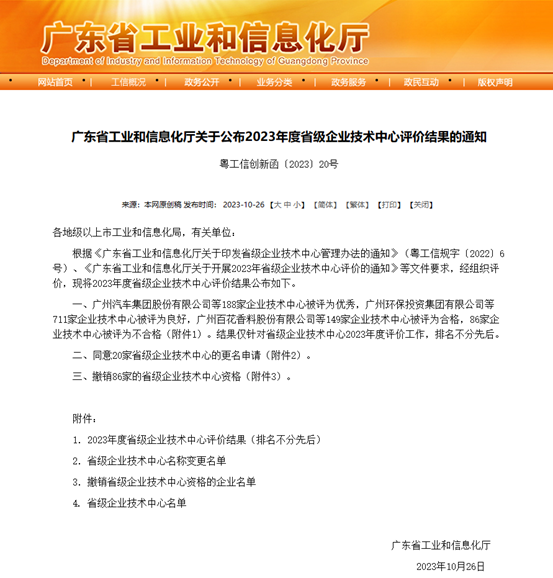 近日,广东省工业和信息化厅公布2023年度省级企业技术中心评价结果,爱体育在线平台有限公司顺利通过本次评价,连续多年获评省级企业技术中心称号。