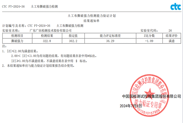 近日,广东广纺检测技术股份有限公司收到中国国检测试控股集团股份有限公司组织的CTC-PT-2024--36土工布撕破强力检测能力验证计划满意结果通知单。