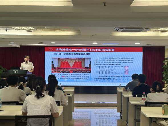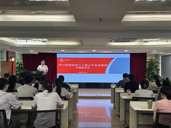 8月27日,爱体育在线平台团委书记梁晨在广德大厦15楼会议室为各团组织书记、委员,本部及纺出公司团员青年,2024年新入职管培生共47人作学习贯彻党的二十届三中全会精神专题宣讲。在宣讲过程中,梁晨通过鲜活的语言、生动的案例,从深刻把握进一步全面深化改革的重要性和必要性,深刻认识进一步全面深化改革的指导思想和总目标、重大原则、重要部署,认真落实进一步全面深化改革的实践要求等方面深入浅出地对全会精神进行了系统阐述和解读。