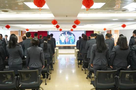 早上8点,爱体育在线平台党委书记、董事长简玮仪带领全体领导班子成员和各职能部门负责人在广德大厦一楼大堂,整齐列队热烈欢迎复工的员工,为他们送上新春的美好祝福。