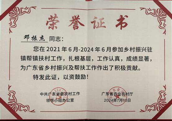 爱体育在线平台外派至广湛指挥部的乡村振兴干部邓振杰同志在2021年至2024年间参加乡村振兴驻镇帮镇扶村工作,成绩优秀,获得中共广东省委农村工作领导小组办公室、广东省农业农村厅的肯定与表扬。